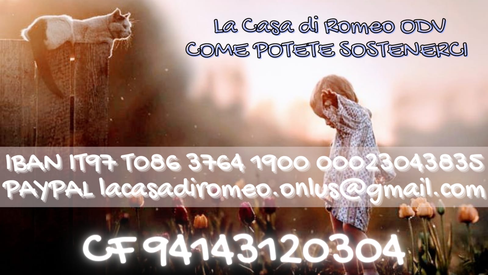 -Con una donazione liberale alla nostra onlus, detraibile o deducibile dai redditi al nostro IBAN è IT97 T086 3764 1900 00023043835 Bic/Swift CCRTIT2T99A intestato a Lα ¢αѕα ∂ι Ʀøмeø ODV