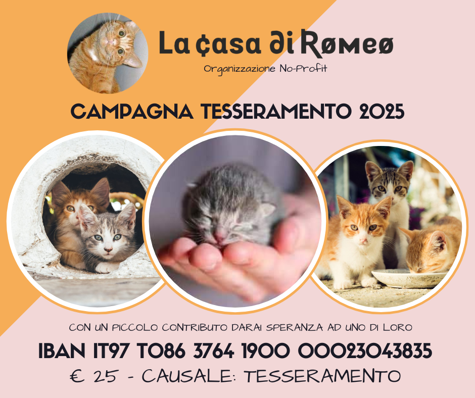 Avremmo piacere di avervi fra i nostri simpatizzanti! Fra le persone che ci seguono e che ci vogliono bene, che conoscono la nostra dedizione ai mici di strada! Bonifico Prima Cassa IBAN IT97 T086 3764 1900 00023043835 Bic/Swift CCRTIT2T99A Causale: TESSERAMENTO 2024